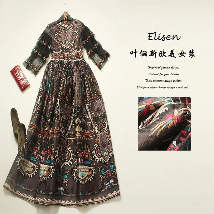 Luxury Long Dresses 2016 Fall Europe Fashion New Russian Style Sequins Long Sleeve Vintage Print Big Swing Slim Elegant DressUSD 71.00/piece